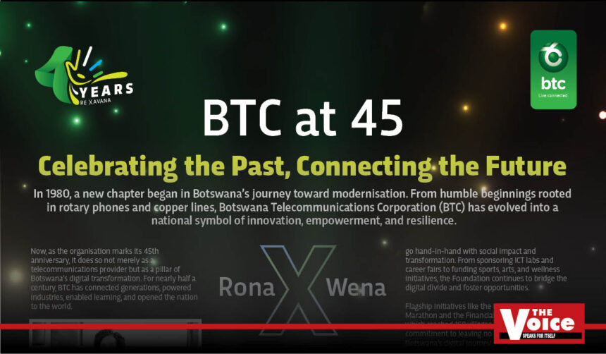 This year, BTC proudly marks 45 years of connecting Batswana—transforming from a humble telecom provider to a driving force in Botswana’s digital evolution. Since 1980, BTC has pioneered key milestones including Botswana’s first Earth Station, rural connectivity through Nteletsa, listing on the Botswana Stock Exchange, and launching advanced technologies like 4.5G and the Sentlhaga Data Centre.